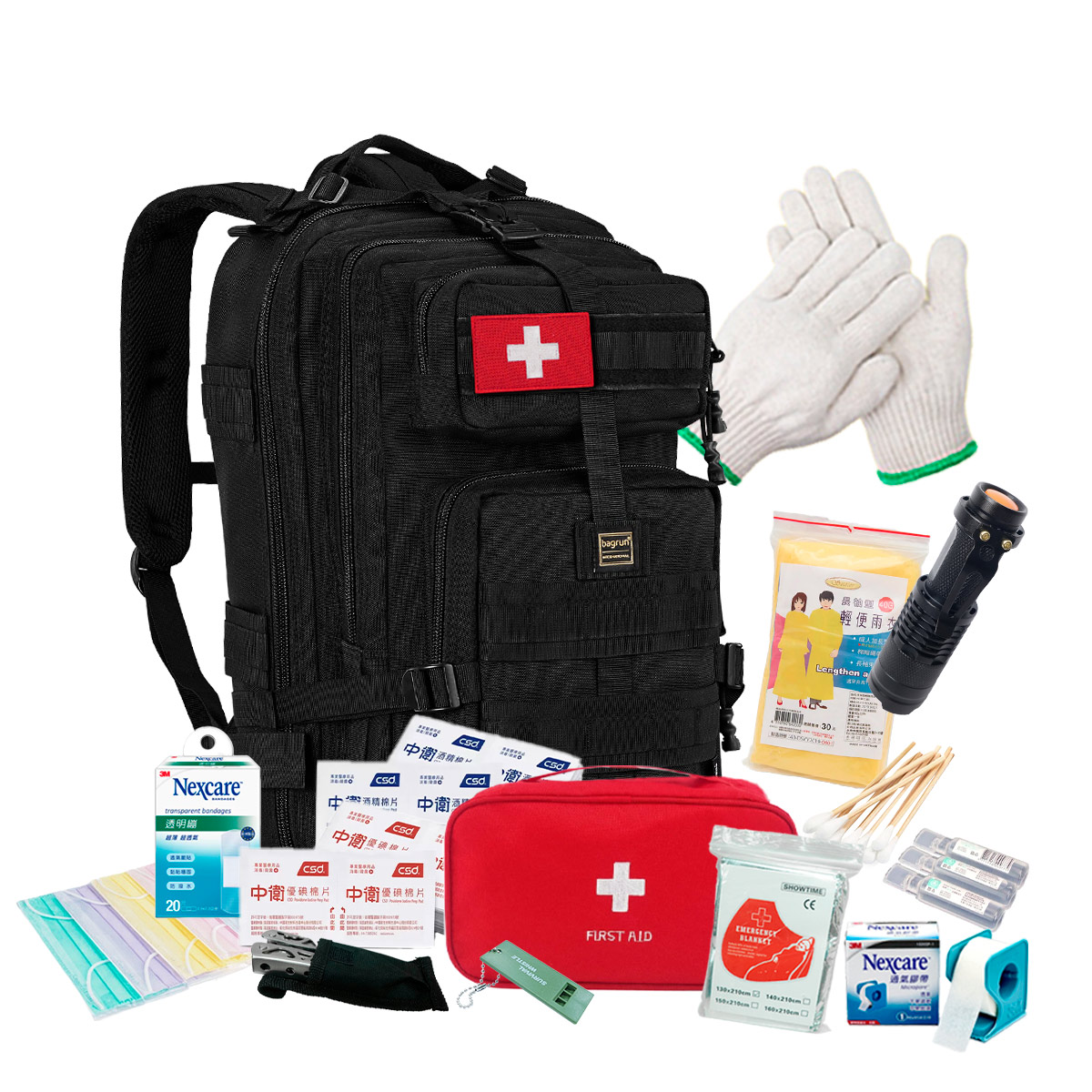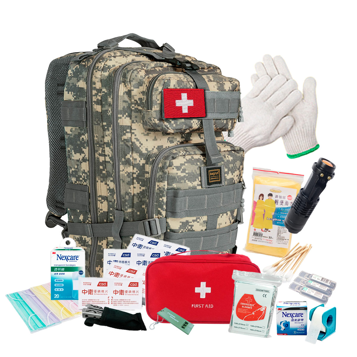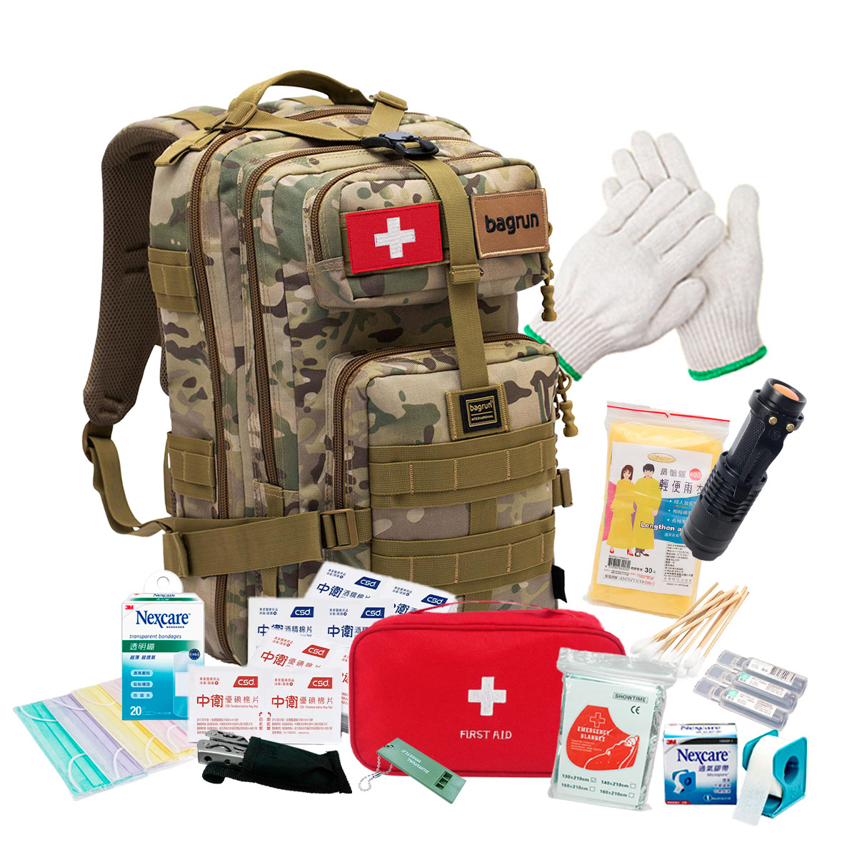 | 備註 | 本商品含物資:醫療魔鬼氈布章、 求生哨、 LED手電筒(未附電池)、耐磨手套、多功能工具鉗、醫療包(生理食鹽水綿片10片、2x2 和 3x3 減菌紗布各2包、半吋指膠附切台1個、10支滅菌棉棒2包、防水OK蹦5片、一般OK蹦40片、酒精棉片6片、優碘棉片8片、塑膠鑷子1支)符合醫療器材許可證字號、 太空保溫毯、口罩、輕便雨衣 |