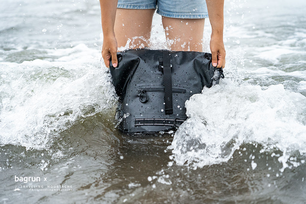畢竟背包裡裝著電腦與各種重要物品,我們一開始還很含蓄的先在岸邊潑潑水,但在看到潑上去的水迅速結成水珠,稍微一抖動就會滴落後,我們頓時對背包的防水功能多了不少信任。因而也就放了開來(?)先是帶著 bagrun 氣彈系列巔峰防水背包到海裡讓浪花打,發現它因為內裡充滿空氣會半漂浮於水上後,還稍微壓了壓它讓它浸海水。