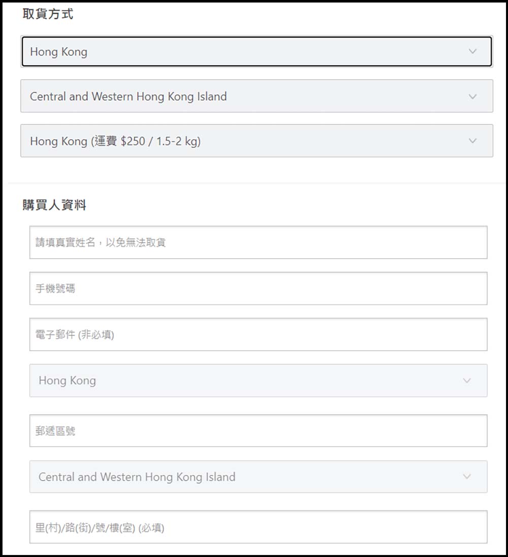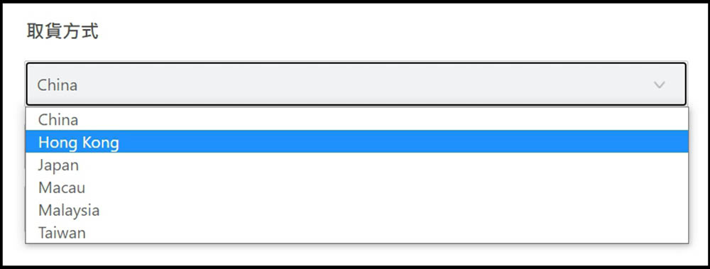 1、線上落單完成後,於結帳頁面的「取貨方式」內選擇 Hong Kong.