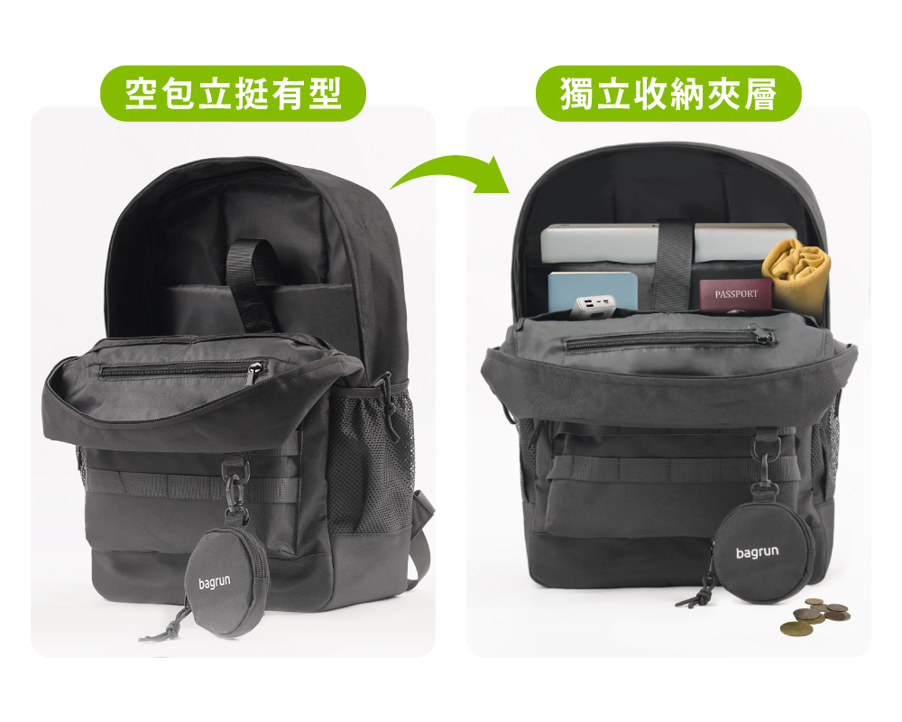 | 結構 | 主袋x1、外拉鍊夾層x1、左右邊網袋x1、筆電夾層x1、內層拉鍊層x1、內部分隔袋x1 |